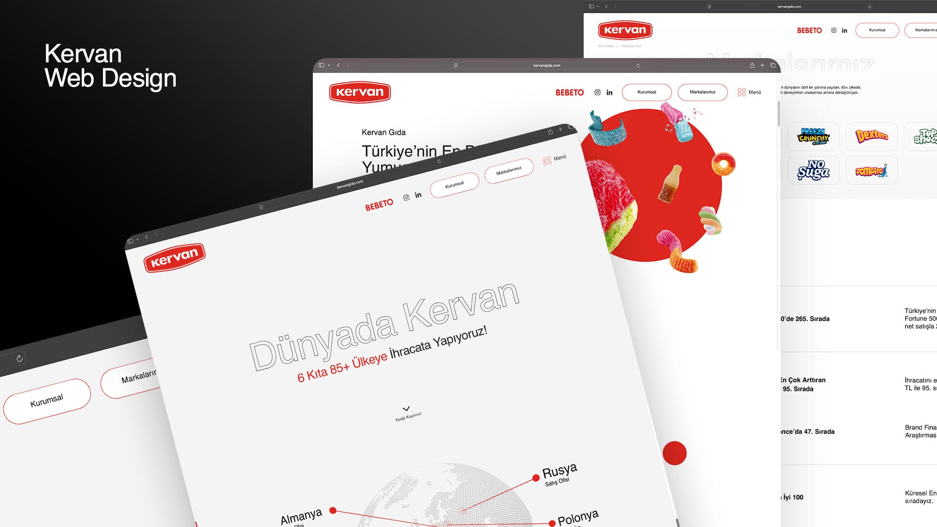 Kervan Gıda için hazırlanan kurumsal web sitesi, markanın geniş ürün portföyünü, üretim gücünü ve global operasyonlarını net ve güven veren bir dijital yapı içinde sunmak amacıyla tasarlandı. Ürün grupları, marka hikâyesi ve kurumsal bilgiler; kullanıcıların kolayca erişebileceği, sade ve kurumsal bir bilgi mimarisiyle yapılandırıldı. UI/UX tasarımı, performans odaklı teknik altyapı ve çok dilli yapıya uygun sistem kurgusu ile marka, uluslararası ölçekte güçlü bir dijital görünürlük kazandı.